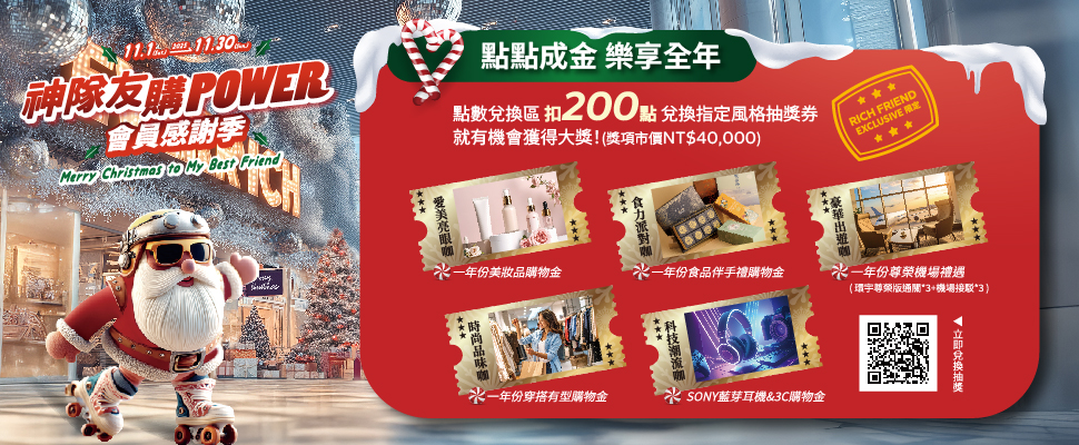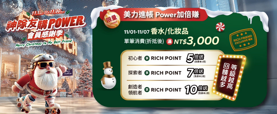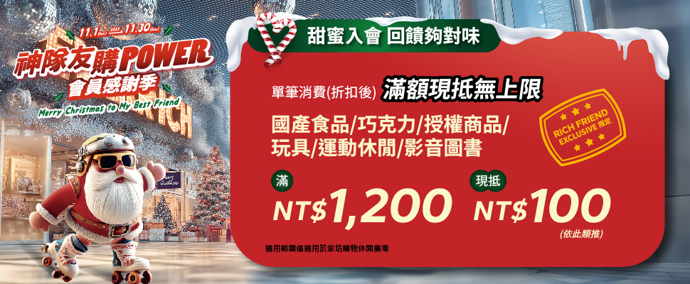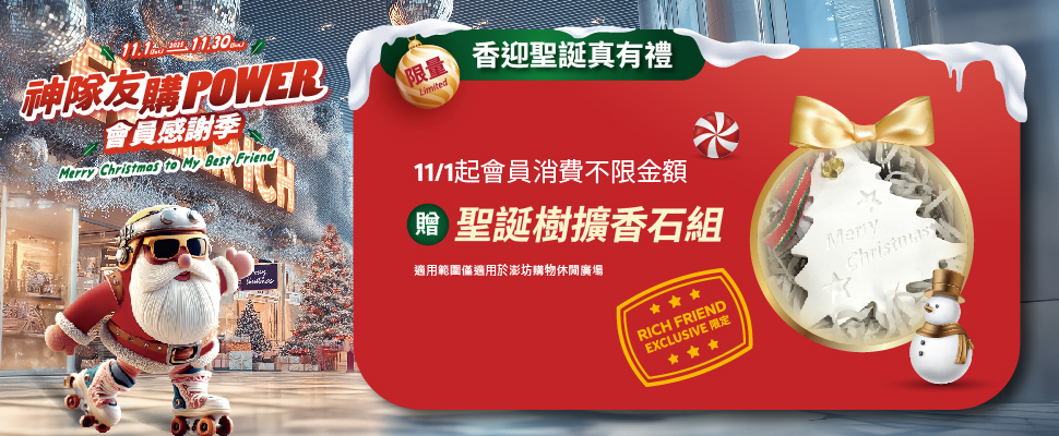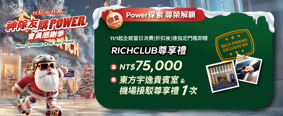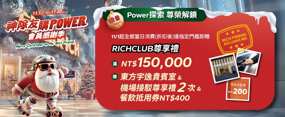 11/01起 全館當日消費(折扣後)達指定門檻即贈RICHCLUB尊享禮