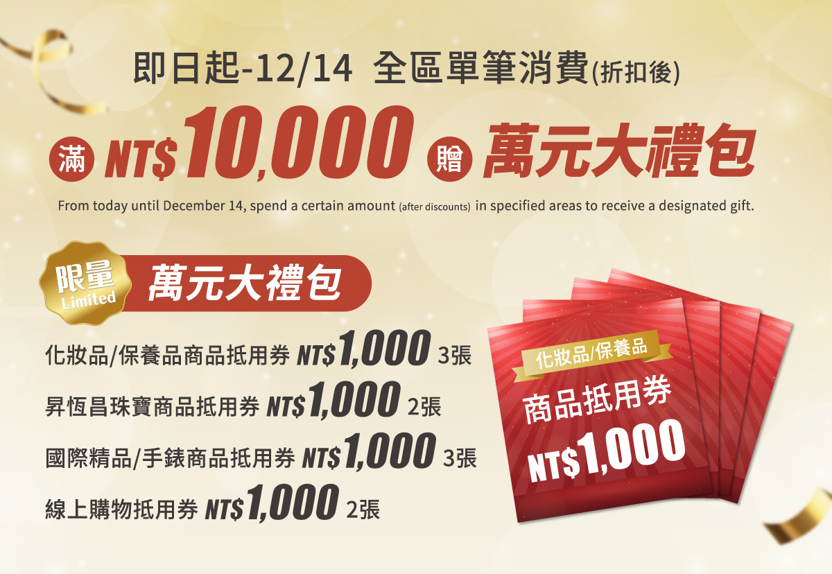 單筆消費滿 NT$10,000,即可獲得 「萬元大禮包」乙份。