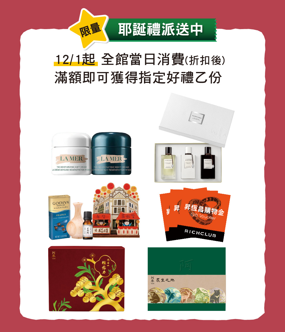 12/1-12/25 RICHCLUB 領航者、創造者會員 憑聖誕禮物兌換券至國際精品/珠寶/太陽眼鏡/手錶/流行飾品區任一消費即贈聖誕禮物乙份