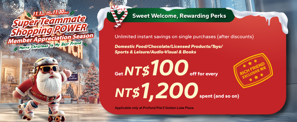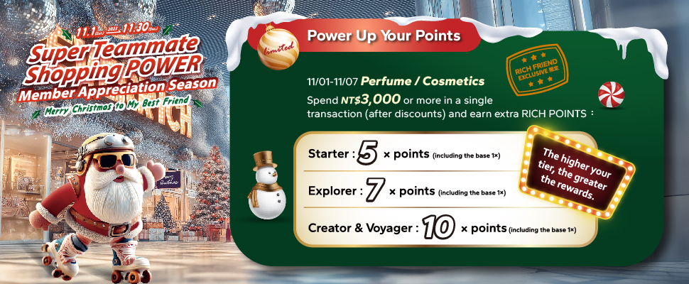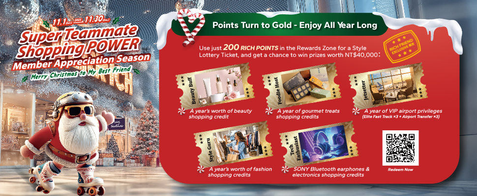 Spend NT$3,000 or more in a single transaction (after discounts) and earn extra RICH POINTS: