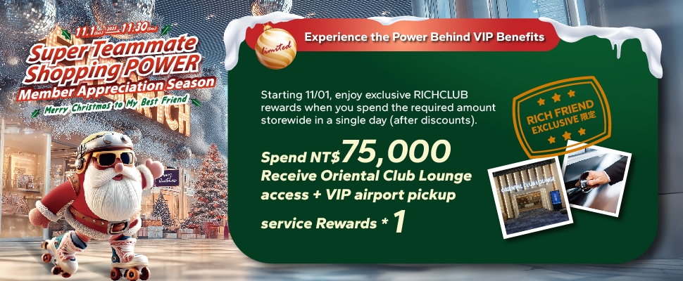 Spend NT$200,000 Receive Oriental Club Lounge access+VIP airport pickup service Rewards*3+NT$400 dining voucher+RICH POINTS 3,000