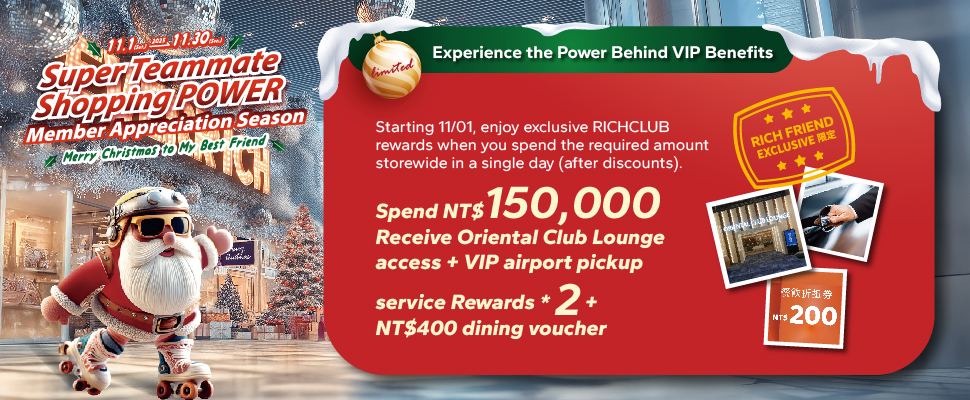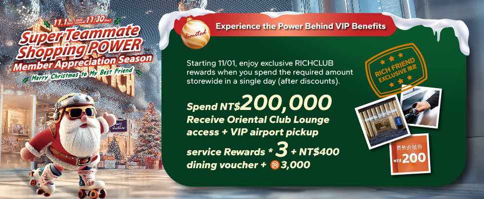 Starting 11/01, enjoy exclusive RICHCLUB rewards when you spend the required amount storewide in a single day (after discounts).
